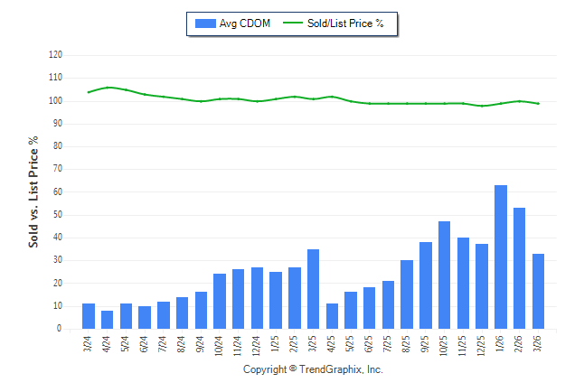 March 2026 Average Continuous Days on Market trend Remains Steady and Sold/List Price Ratio Remains Steady**