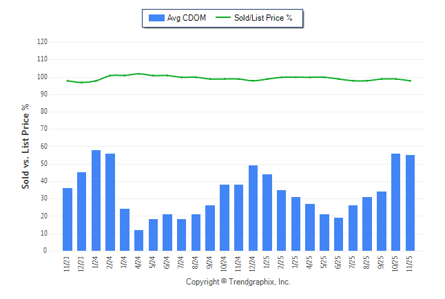 November 2025 Average Continuous Days on Market trend Remains Steady and Sold/List Price Ratio Remains Steady**