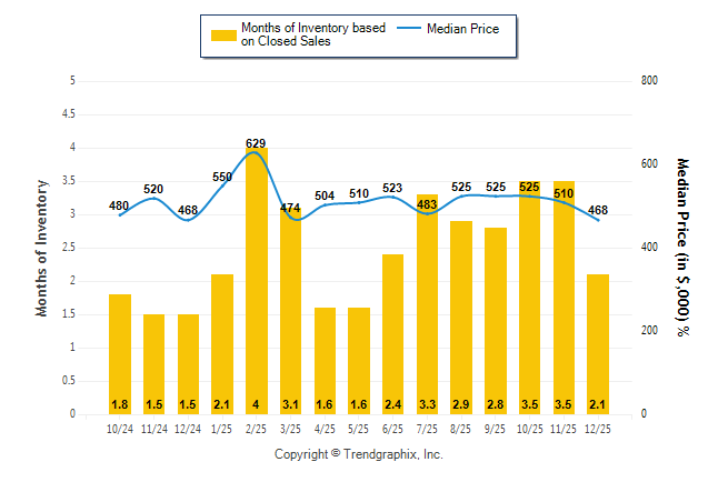 Curnt vs. Same Month 1 Yr Ago: Months of Inventory (Closed Sales) up40.9% | Median Sold Price 0%