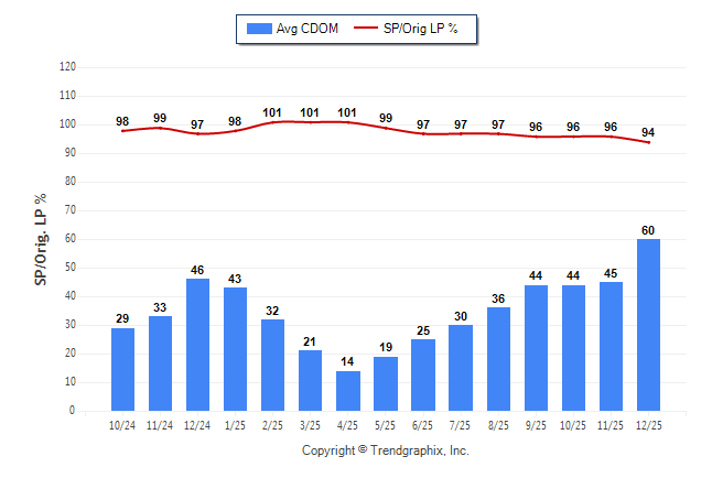 December 2025 Average Continuous Days on Market trend was Rising and Sold/Original List Price Ratio was Falling**