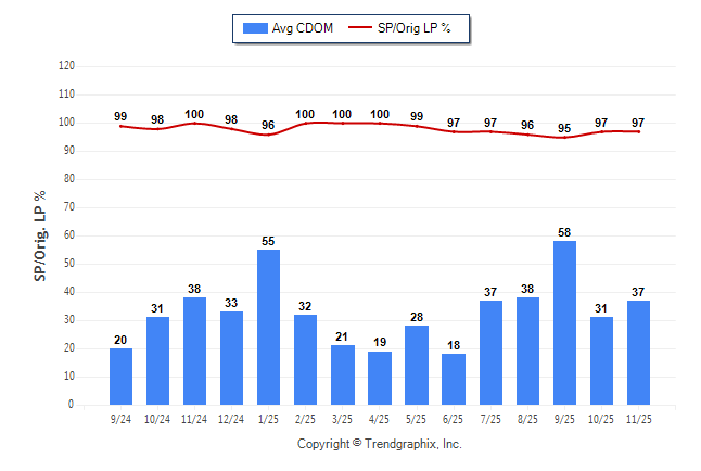 November 2025 Average Continuous Days on Market trend Remains Steady and Sold/Original List Price Ratio Remains Steady**
