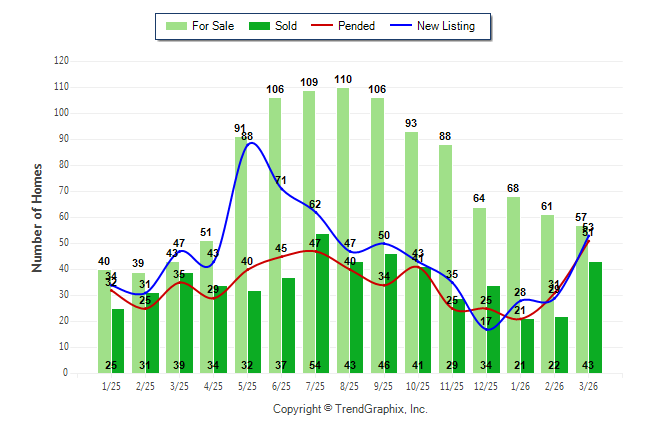 Curnt vs. Same Month 1 Yr Ago: For Sale up32.6% | New Listing up12.8% | Sold up10.3% | Pended up45.7%