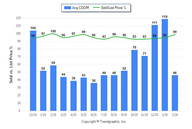February 2026 Average Continuous Days on Market trend Remains Steady and Sold/List Price Ratio was Rising**