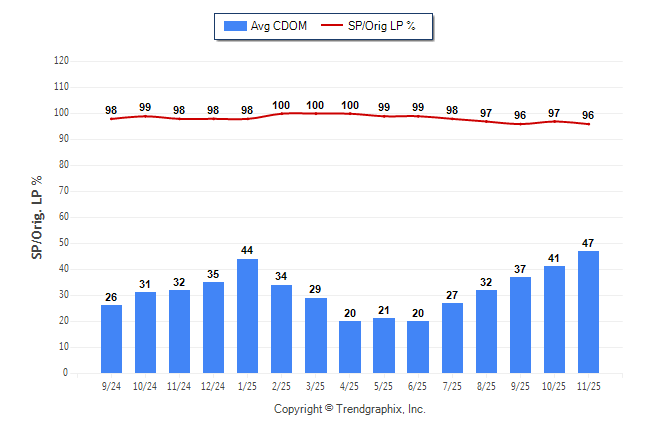 November 2025 Average Continuous Days on Market trend was Rising and Sold/Original List Price Ratio was Falling**