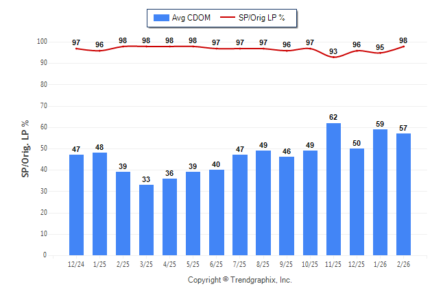 February 2026 Average Continuous Days on Market trend Remains Steady and Sold/Original List Price Ratio Remains Steady**