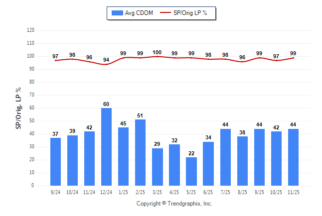 November 2025 Average Continuous Days on Market trend was Rising and Sold/Original List Price Ratio was Rising**