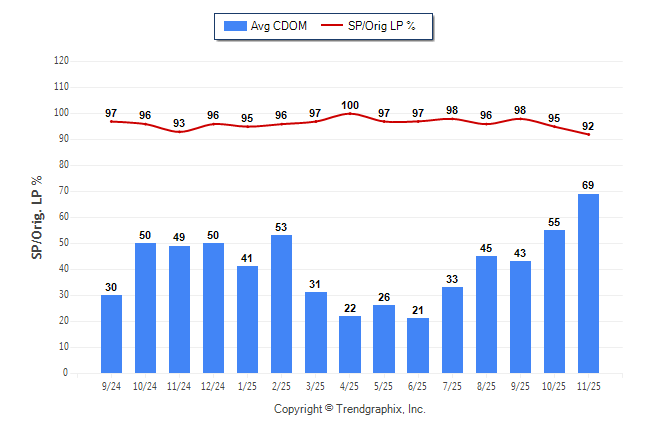 November 2025 Average Continuous Days on Market trend was Rising and Sold/Original List Price Ratio was Falling**