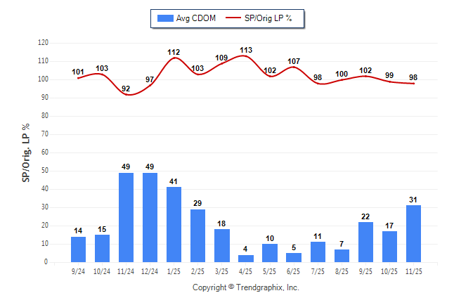 November 2025 Average Continuous Days on Market trend was Rising and Sold/Original List Price Ratio was Falling**