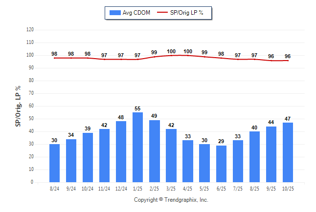 October 2025 Average Continuous Days on Market trend was Rising and Sold/Original List Price Ratio was Falling**