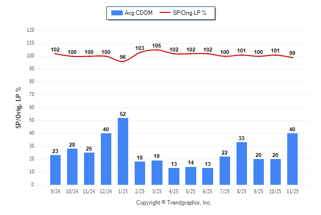 November 2025 Average Continuous Days on Market trend was Rising and Sold/Original List Price Ratio was Falling**