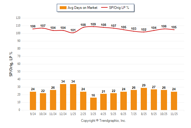 November 2025 Average Days on Market trend Remains Steady and Sold/Original List Price Ratio Remains Steady**
