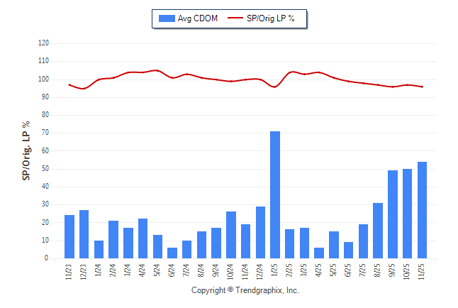 November 2025 Average Continuous Days on Market trend was Rising and Sold/Original List Price Ratio was Falling**