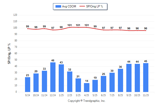 November 2025 Average Continuous Days on Market trend was Rising and Sold/Original List Price Ratio was Falling**