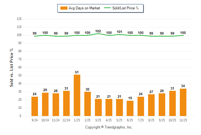 November 2025 Average Days on Market trend was Rising and Sold/List Price Ratio Remains Steady**