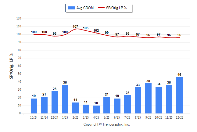 December 2025 Average Continuous Days on Market trend was Rising and Sold/Original List Price Ratio was Falling**