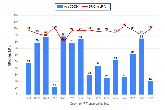 November 2025 Average Continuous Days on Market trend Remains Steady and Sold/Original List Price Ratio Remains Steady**
