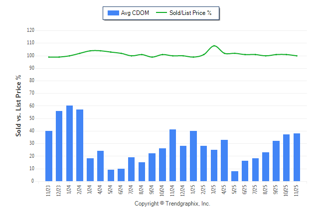 November 2025 Average Continuous Days on Market trend was Rising and Sold/List Price Ratio Remains Steady**