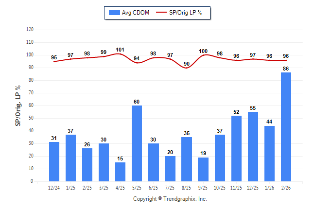 February 2026 Average Continuous Days on Market trend was Rising and Sold/Original List Price Ratio was Falling**