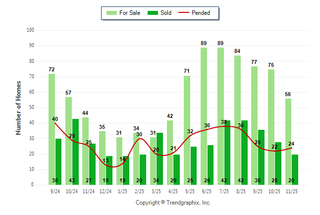 Curnt vs. Same Month 1 Yr Ago: For Sale up27.3% | Sold down-25.9% | Pended down-4%