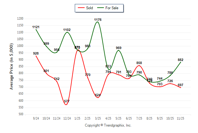 November 2025 Average For Sale Price was Appreciating and Average Sold Price was Depreciating**